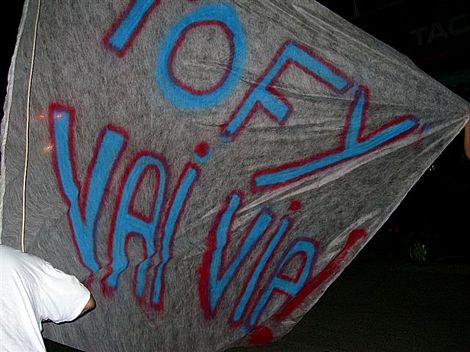 "Tofy Vai Via" . Spicca la scritta in cima alla bandiera alla Coop vicino alla Cittadella. Un gruppo di giovani contro Tofanelli
