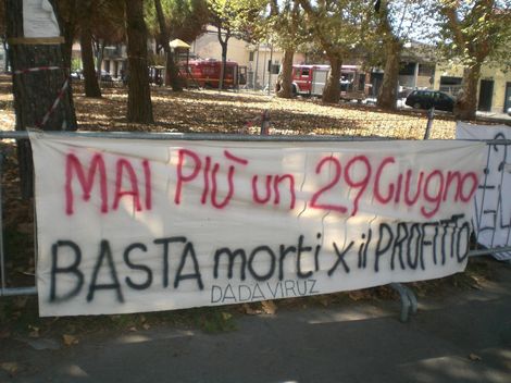 Il Capitale uccide per questo per noi la sicurezza è anticapitalista o non è. Con questo spirito a due mesi di distanza da quella tragedia, nella quale abbiamo perso amiche e compagne, abbiamo deciso di ricordare attaccando tre striscioni uno in via Ponchielli teatro luogo simbolo della strage, uno lungo la linea ferroviaria all'altezza del canale Burlamacca e uno fuori dalla nostra sede al Varignano.