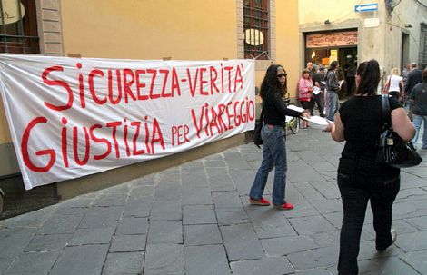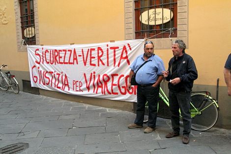 Disastro a Viareggio mercoledì 23 settembre 2009 3“Trentuno morti e zero indagati”, era questo il testo del volantino distribuito ieri mattina durante il presidio davanti all'ingresso del Tribunale di Lucca in via Galli Tassi, organizzato da “Assemblea 29 giugno” e dai comitati “Avif” e “Abitanti di via Ponchielli” per chiedere “ Verità e Giustizia”.