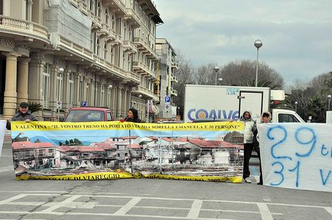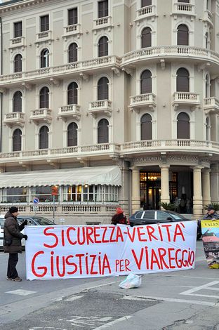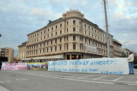 Disastro a Viareggio giovedì 17 dicembre 2009 0Volantinaggio e striscioni di protesta, ieri e oggi davanti al Grand Hotel Principe di Piemonte dove per due giorni i componenti della Task Force Freight Wagon Maintenance (Manutenzione Carri Merci) europea hanno incontrato le autorità locali per un’analisi delle questioni relative alla sicurezza ferroviaria.