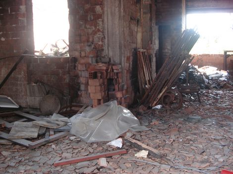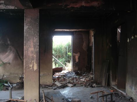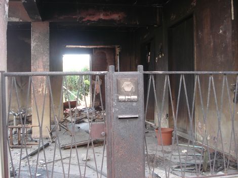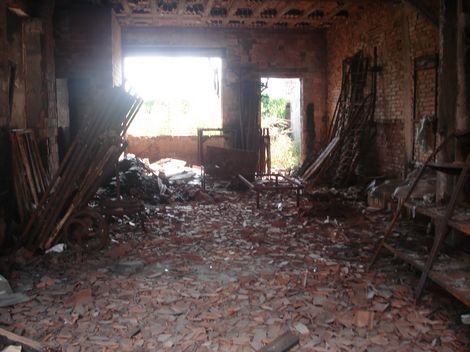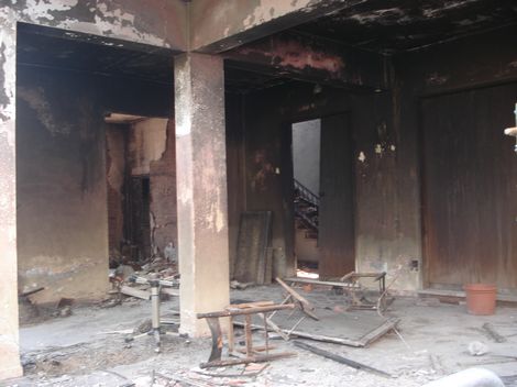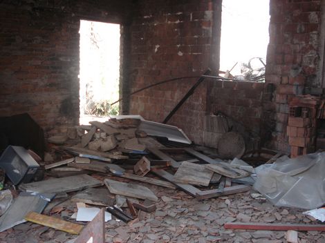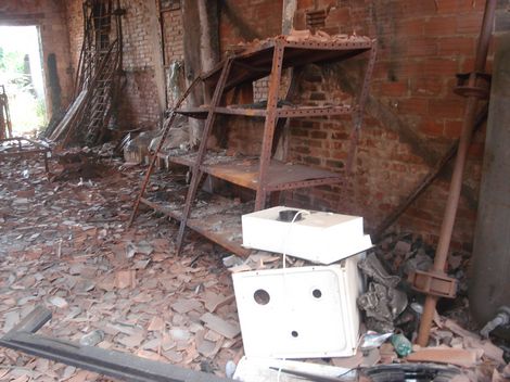 Da un lato, le mura sono ancora annerite dal fuoco e si scorgono rottami di biciclette e muri crollati...