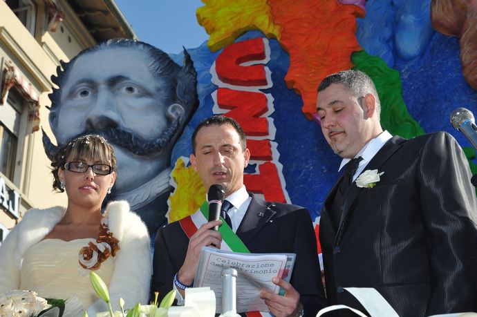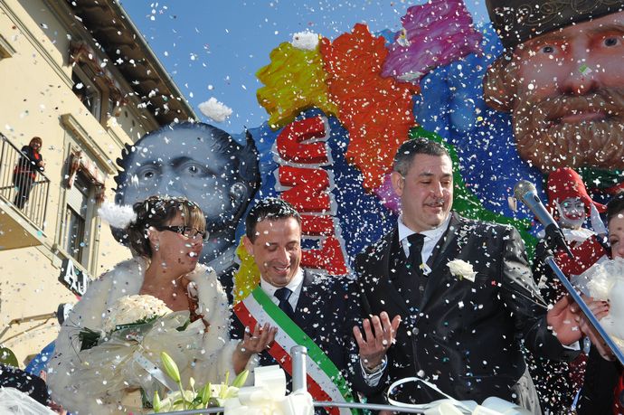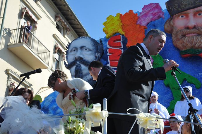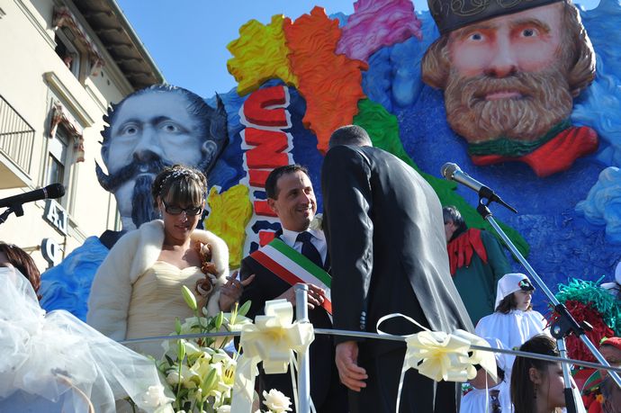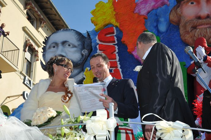 La cerimonia nuziale è stata celebrata dal presidente della Fondazione Carnevale Alessandro Santini che alle 11 ha celebrato in Comune il rito civile e alle 14,30 in piazza Mazzini, cuore delle sfilate del Carnevale di Viareggio ha chiesto ai neo sposi di pronunciare il fatidico SI di fronte al folto pubblico del terzo corso mascherato del Carnevale di Viareggio.