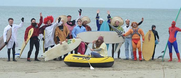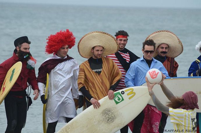 Carnevale mercoledì 16 marzo 2011 0In 190 anni la città di Viareggio ne ha viste molte: la nascita e lo sviluppo del turismo balneare e della cantieristica, la crisi di entrambe, ben più di cento Carnevali, disastri e ricostruzioni. Viareggio ha dato i natali ad allenatori di pallone, attrici e registi ed anche a molti dei 17 mitomani che sabato 12 marzo 2011 hanno sfidato un clima polare per il V atto di Surfando a Carnevale: la surfata in maschere di carnevale. L’annuale zingarata marina è stata colpita dalla patana, che in vernacolo viareggino significa “mare piatto”.