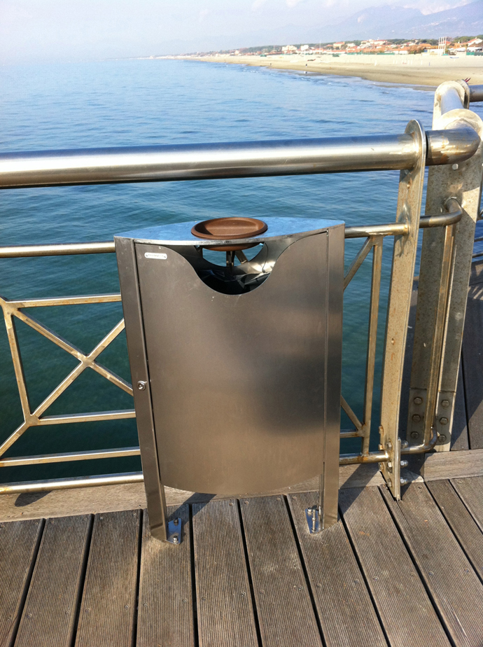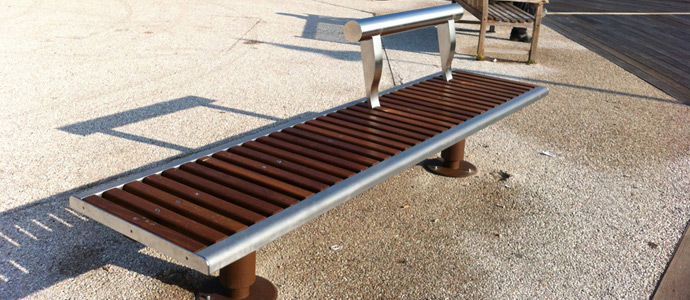 Si tratta di nove panchine in acciaio AISI 316 elettro-lucidato e legno di Iroco e sei cestini sempre in acciaio AISI 316 elettro lucidato.