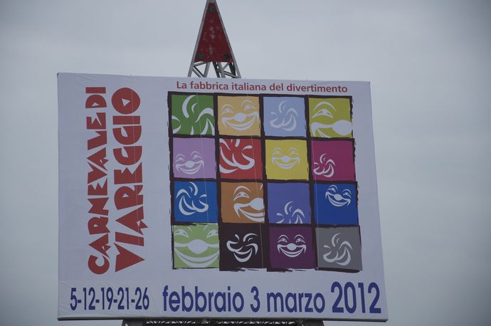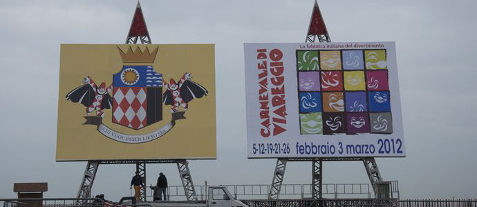 Carnevale sabato 28 gennaio 2012 6Sono stati installati in piazza Mazzini i nuovi cavalletti su cui compare la sponsorizzazione del Carnevale di Viareggio 2012, che vanno a sostituire quelli dello scorso anno.