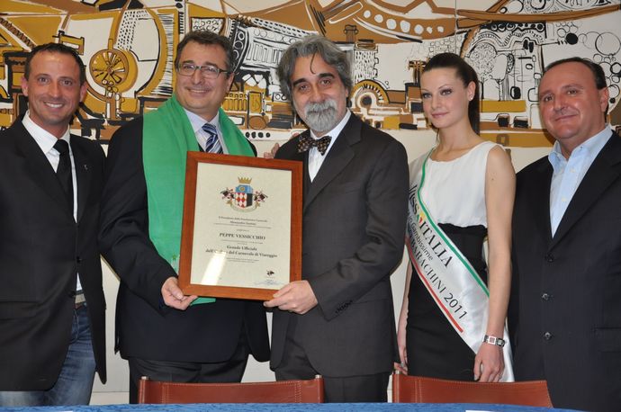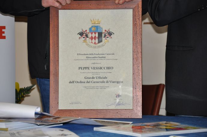 A Viareggio, è arrivato anche il musicista, arrangiatore, direttore d'orchestra, e personaggio televisivo italiano, Peppe Vessicchio che ha ricevuto dal Presidente della Fondazione Carnevale Alessandro Santini l’onorificenza di Grande Ufficiale dell’Ordine del Carnevale di Viareggio.