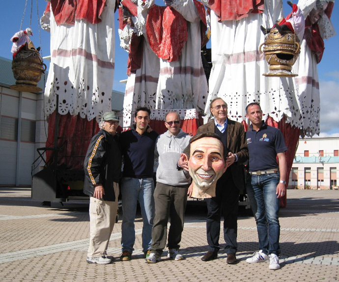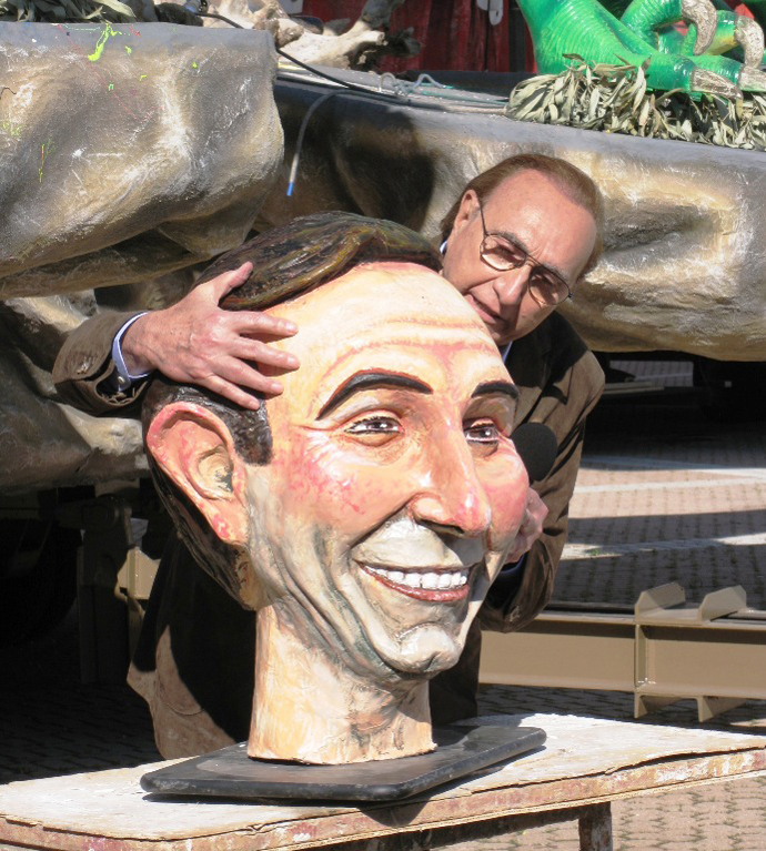 Ad accogliere il conduttore è stato il Presidente della Fondazione Carnevale Alessandro Santini che ha illustrato la storia della manifestazione e spiegato alcune curiosità sui carri. Arnaldo Galli, decano dei carristi, ha invece raccontato aneddoti sui lavori che ha eseguito per i più bei film di Federico Fellini. Luca Bertozzi, fresco di promozione nelle mascherate in gruppo, ha invece presentato la sua maschera isolata, mentre Fabrizio Galli ha tirato fuori dall’hangar una chicca assoluta: il modellino della caricatura di Baudo che fece per preparare il suo primo carro di seconda categoria: “Salverò la Rai”, realizzato nel 1987 e dedicato proprio al mattatore della Tv di Stato.