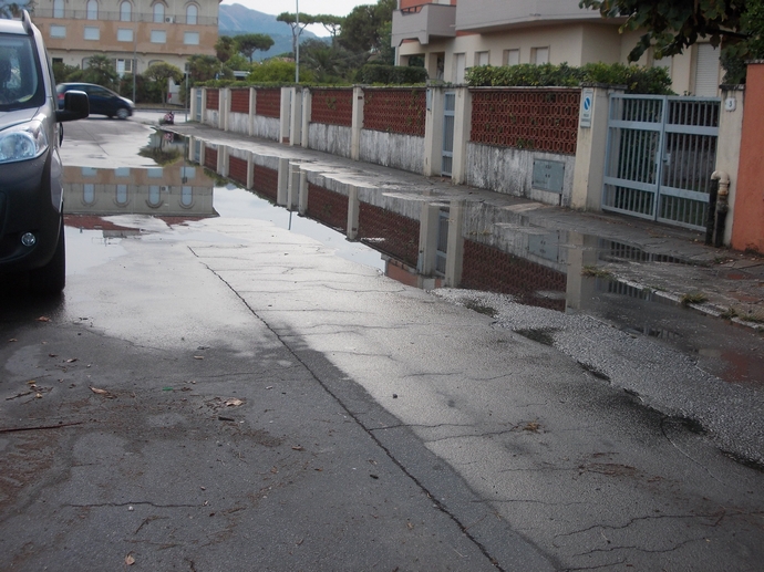 A segnalare i piccoli problemi del Lido sono i cittadini della zona che riferiscono anche che in Piazza Castracani c'è l'erba alta e anche l'acqua (è alta) e probabilmente avrebbe bisogno di una via di sfogo che non c'è come ben si vede dalle fotografie. "Non sarebbe il caso di aprire una griglia che porti via le acque? E magari anche di ripulire le griglie, molte delle quali otturate da terra e aghi di pino?"