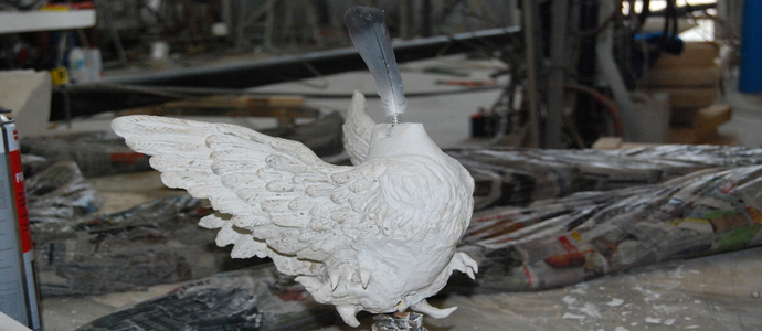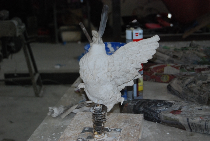 "E' un pollo pollo, un gran bel gallo arrabbiato tutto nero come il nostro futuro, nero come quando si dice che siamo incavolati neri, nero perchè deve essere d'impatto"... e a parte qualche particolare come il bargiglio che invece sarà oro, a rimembranza del famoso carro del bene e del male che facemmo col Vannucci: se lo ricorda, vero? (quello sì me lo ricordo... per fortuna! NdR)