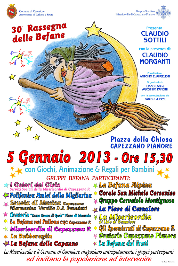 Sedici gruppi di befane partecipanti per un pomeriggio all’insegna del divertimento e della tradizione: a presentare l’evento, Claudio Sottili. Il coordinamento è di Antonio Evangelisti e l’organizzazione Iliano Lari e Agostino Pardini. Prevista anche la partecipazione del mattatore comico Claudio Morganti e di Fabio 2 di RMS.