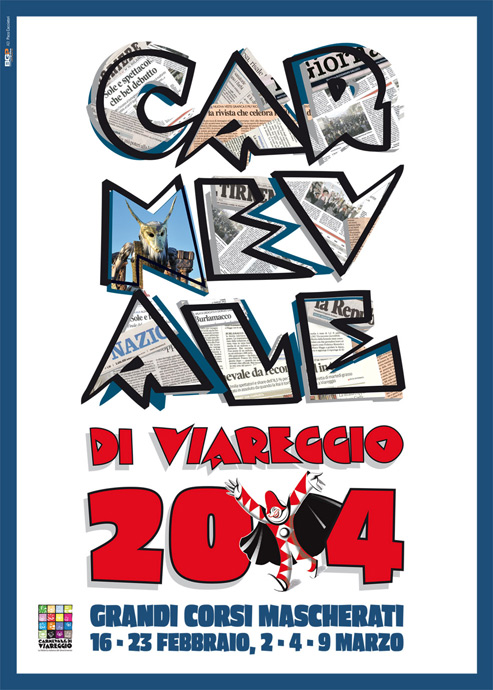 Se è vero che tutte le notizie del mondo finiscono sui carri di Viareggio attraverso la cartapesta, materia prima delle gigantesche macchine del divertimento, il manifesto grafico, realizzato per promuovere i cinque Corsi Mascherati del 2014, vuole essere un tributo al lavoro dei Maestri costruttori viareggini che proprio della cartapesta hanno fatto un'arte. E così ritagli di carta di giornale compongono le lettere della parola Carnevale che, divise in tre parti, sono protagoniste nel manifesto. L’effetto 3D, inoltre, è un tributo ai colossali volumi dei carri viareggini.