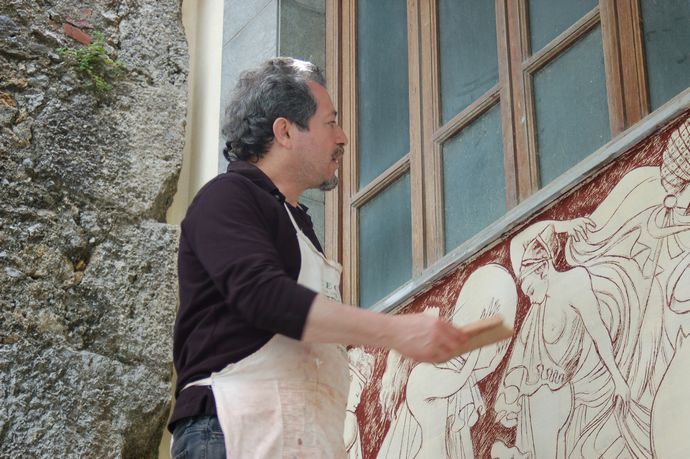 A Casoli oggi effettueranno le proprie opere Franco Pagliarulo - direttore artistico della manifestazione - Marco Pasini e Manuela Sabatini (foto di Viareggino realizzate questo pomeriggio proprio agli artisti).