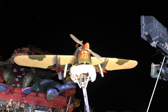 Questa sera il Lungomare è stato oinfatti nuovamente invaso dal gigantismo delle costruzioni allegoriche, dai loro movimenti, luci, colori, musica e dal brio delle maschere.