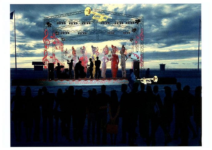 Ambientazione jazz per piazza Mazzini. Alle spalle del palcoscenico, sul Belvedere delle Maschere, verranno collocate le cantanti in cartapesta del carro di Lebigre e Roger dello scorso anno. Attorno ad essere elementi musicali fungeranno da contorno ed arricchiranno la nuova scenografia.