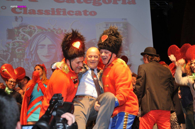 Infine sono stati premiati i protagonisti, le costruzioni in cartapesta, partendo dai primi tre classificati delle maschere isolate , passando poi alla premiazione delle mascherate di gruppo, i carri di seconda categoria e infine i carri di prima categoria con il vincitore Alessandro Avanzini che e' salito sul palco a ritirare il premio con il cappello a cuore in testa dei Fratelli Cinquini esclamando "peace and love"