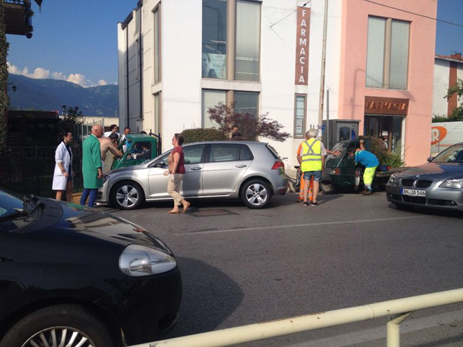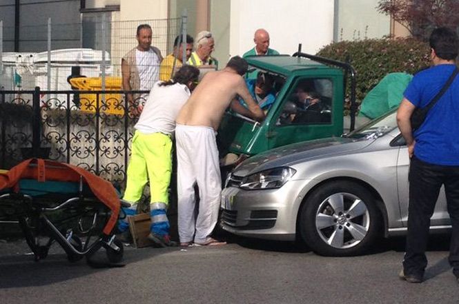 Coinvolte una Volkswagen grigia e un ape verde, che ha avuto la peggio e che ha costretto la donna che guidava il mezzo all'interno dell'abitacolo