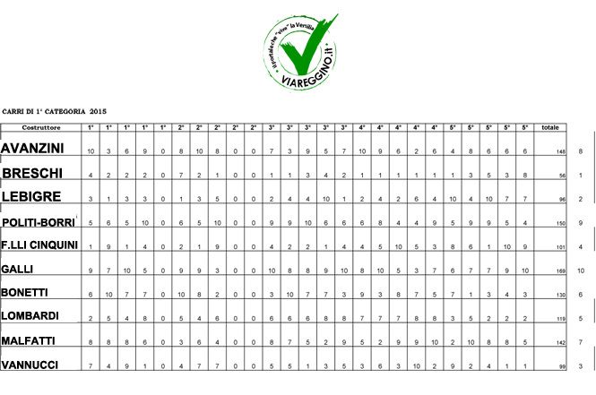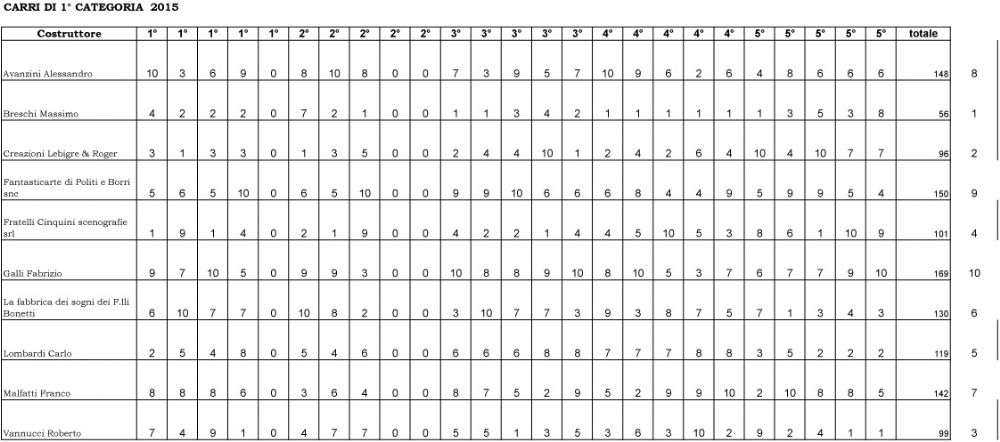 Di seguito i giurati per i carri di prima gategoria e le relative votazioni: