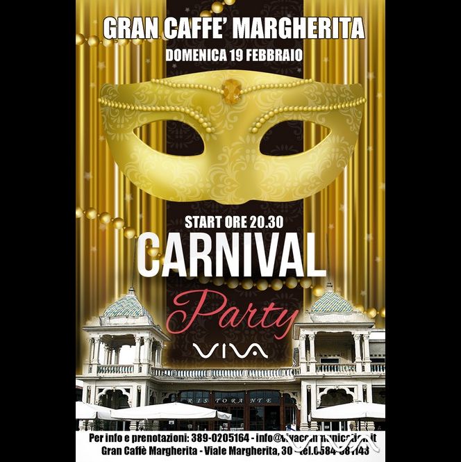 Per info e prenotazioni: info@vivacommunication.it - tel. 389-0205164 – [url=https://www.facebook.com/events/1898011860427338/]Pagina Facebook (Carnival Party). Gran Caffè Margherita – Viale Margherita, 30 - tel. 0584-581143