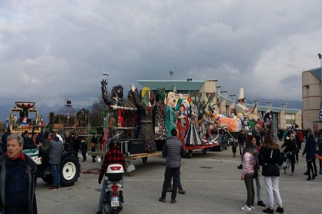 I colori dei grandi carri allegorici si stagliano nel cielo plumbeo, ma si sa, non è una novità per Viareggio e un po' di incertezza aumenta la gioia dell'attesa.
