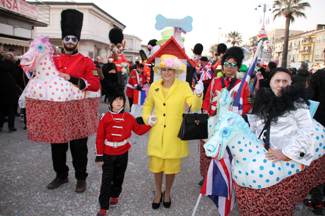 Anche la Regina Elisabetta é arrivata a Viareggio per festeggiare il Carnevale. Come al Giubileo, sfila per i viali accompagnata dalle sue fedele guardie del corpo, trasformate in simpatici cani e solo gli amati corgi sembrano mancare in questo buffo gruppo. In seguito alla dipartita della storica sovrana, la mascherata diventa quindi un rispettoso saluto a una donna che ha saputo distinguersi negli anni in tutto il mondo.