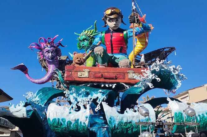 VIAREGGIO - Prosegue la sfilata tra musica e mille colori. Dopo Avanzini sfilano in piazza Mazzini La Compagnia del Carnevale e Allegrucci con il carro "Va dove porta il cuore" - liberamente ispirato alla Tamaro, un carro dedicato ai giovani con il ragazzo al centro del carro che guarda verso l’orizzonte, mentre alle sue spalle tre arpie lo osservano, cercando di distrarlo.