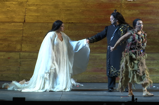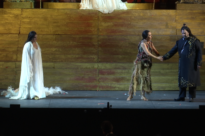 Turandot – che nella regia appare come una regina-fantasma, sospesa tra crudeltà e seduzione, gelo e passione – sarà interpretata, in questa terza recita dal soprano Olga Maslova, mentre nel ruolo di Calaf il tenore Dario Di Vietri, come Liù ci sarà il soprano Alina Tkachuk, nel ruolo di Timur Vittorio De Campo. La produzione è caratterizzata da un impianto scenico visionario, che mescola esotismo e glamour in una Cina fastosa e simbolica, dominata da colori accesi, riflessi d’oro e rosso lacca, motivi orientaleggianti, pannelli mobili, sculture imperiali e scene notturne. Completano il cast Massimiliano Pisapia (Altoum), Sergio Vitale (Ping), Andrea Tanzillo (Pang), Tiziano Barontini (Pong), Luca Dall’Amico (Un mandarino), Andrea Volpini (Il principino di Persia), Irene Celle e Maria Salvini (Ancelle). Sul podio dell’Orchestra del Festival Renato Palumbo; il Coro e il Coro di voci bianche, sono diretti rispettivamente da Marco Faelli e Chiara Mariani.