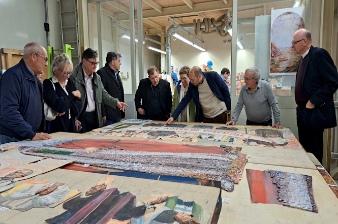 Sabato scorso la delegazione americana formata da Father Eric Ayers, attuale padre superiore della chiesa, dal critico d'arte John T. Spike e dal responsabile, amministratore e coordinatore del progetto negli Usa, Mr. Sam Samorian, questi ultimi accompagnati dalle rispettive consorti, ha fatto visita al laboratorio pietrasantino per un'ultima, esclusiva anteprima dei lavori in corso, ad oggi giunti alla composizione del 30° pannello. Ad accoglierli, insieme ai maestri mosaicisti guidati da Manrico Bertellotti e allo stesso Barsanti, c'erano il sindaco Alberto Stefano Giovannetti e una rappresentanza degli uffici cultura e turismo del Comune: “Gli artigiani di Pietrasanta non sono semplici esecutori – sottolinea il primo cittadino – ma eredi di un sapere che, nel caso dell'arte musiva, trasforma piccoli frammenti di pietra e vetro in narrazioni eterne. Quest'opera è un insieme di eccellenza tecnica e sensibilità artistica, un ponte vivo tra la Toscana e gli Stati Uniti che nascerà grazie alla visione creativa della nostra città e dei nostri maestri artigiani”.