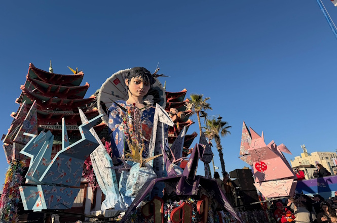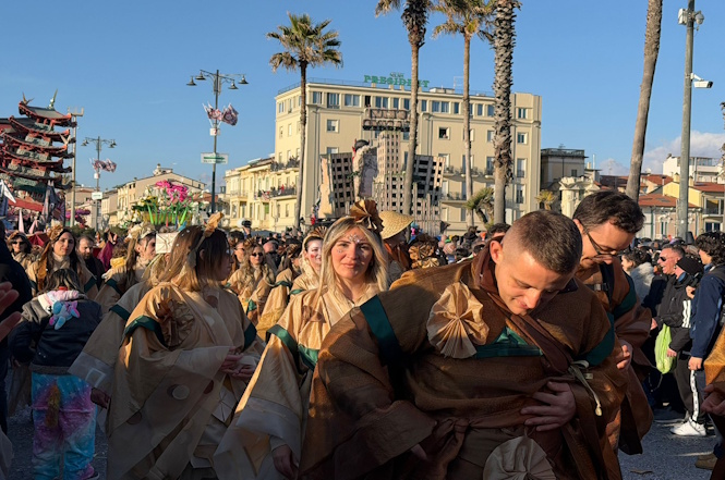 Il prossimo carro a fare il suo ingresso in piazza Mazzini è quello di Carlo e Lorenzo Lombardi, vincitori del Carnevale di Viareggio 2025, che presentano una toccante e intensa narrazione giapponese. La loro opera affronta il tema della guerra, del conflitto e della strage degli innocenti, con un linguaggio poetico e drammatico che commuove il pubblico.