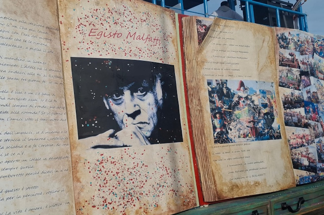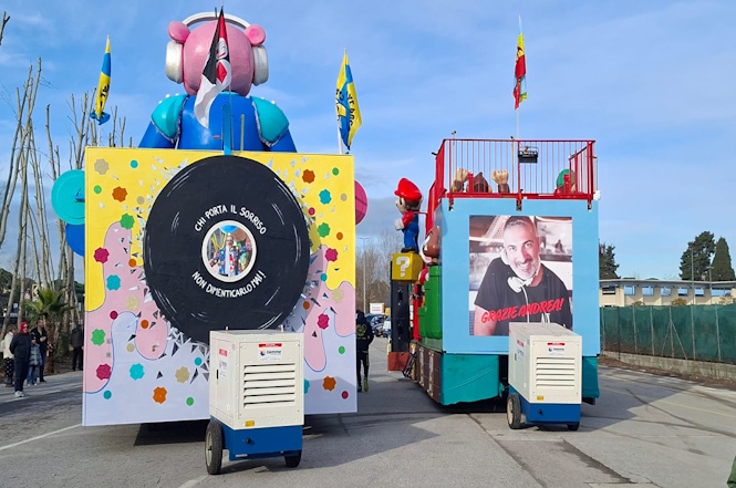La foto di Andrea Paci la ritroviamo su molte costruzioni, in particoalre sulle carrette e pedane aggregative ad omaggiare un amico, un soccorritore, un padre, un marito, ma soprattutto un grande appassionato di musica e di Carnevale