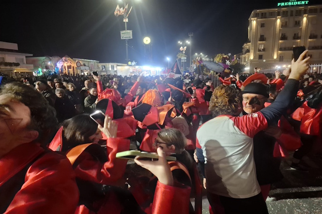 Carnevale giovedì 12 febbraio 2026 0VIAREGGIO - E' arrivato davanti alle tribune il carro "Carnevale futurista. Omaggio a Deplero" di Luciano Tomei e il carrista ha chiesto di accendere i cellulari per ricordare il dj che è nel cuore di tutta la gente del Carnevale, di quel popolo che balla a suon di canzoni e coriandoli. E così dalle tribune è arrivata una coreografia tutta speciale per ricordare e onorare Andrea Paci