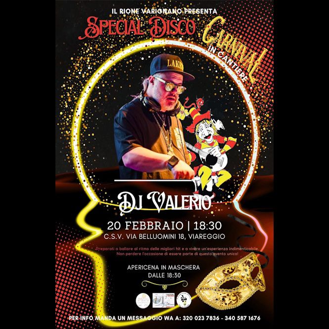 VIAREGGIO - Il Rione Varignano è lieto di invitarvi a una serata speciale, pensata per ballare insieme, senza filtri e senza etichette SPECIAL DISCO CARNIVAL IN CANTIERE: apericena in maschera & DJ set