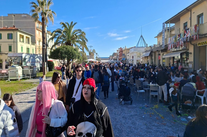 Carnevale sabato 21 febbraio 2026 0VIAREGGIO - E' festa prima ancora di iniziare. Sembra Primavera, è Primavera oggi a Viareggio. I carri sono già sul lungomare per essere ammirati nella loro imponenza, nei colori, nella fantasia che si sprigiona dalla cartapesta.