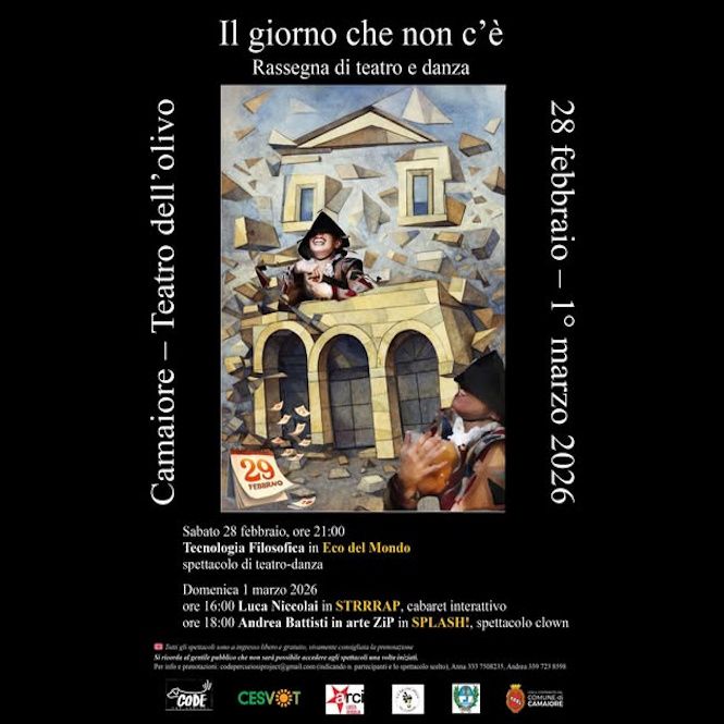 CAMAIORE - “Il giorno che non c’è”, la rassegna di teatro e danza promossa dall’associazione Code per Curiosi APS con il patrocinio del Comune di Camaiore, sbarca al Teatro dell’Olivo da venerdì 27 febbraio a domenica 1 marzo.