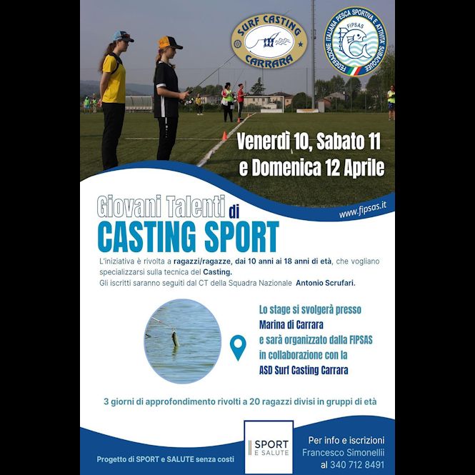 Marina di Carrara – Dal 10 al 12 aprile, Marina di Carrara ospiterà un evento sportivo d’eccellenza dedicato ai giovanissimi (Per i ragazzi dai 10 ai 18 anni di età). Il progetto, promosso dalla Federazione Italiana Pesca Sportiva e Attività Subacquee (FIPSAS) e finanziato da Sport e Salute, sarà realizzato operativamente dalla ASD Surf Casting Carrara: l'evento mira a promuovere discipline internazionali in forte ascesa, recentemente protagoniste ai World Games.