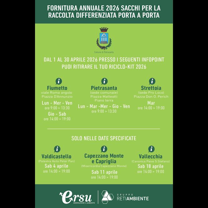 Pietrasanta mercoledì 1 aprile 2026 0PIETRASANTA - Apertura infopoint Ersu per ritiro riciclo-kit annuale