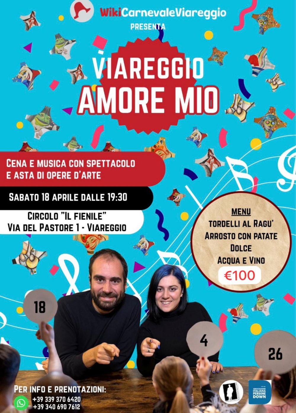 Si esibiranno numerose personalità di spicco del panorama canoro e teatrale viareggino, il tutto condotto da Tommaso Lucchesi e Sara Lazzarini. A chiudere, i volontari di WikiCarnevale terranno un'asta di opere d'arte di carristi e artisti del Carnevale di Viareggio. Il ricavato andrà in beneficenza all'Associazione Italiana Persone Down-AIPD.