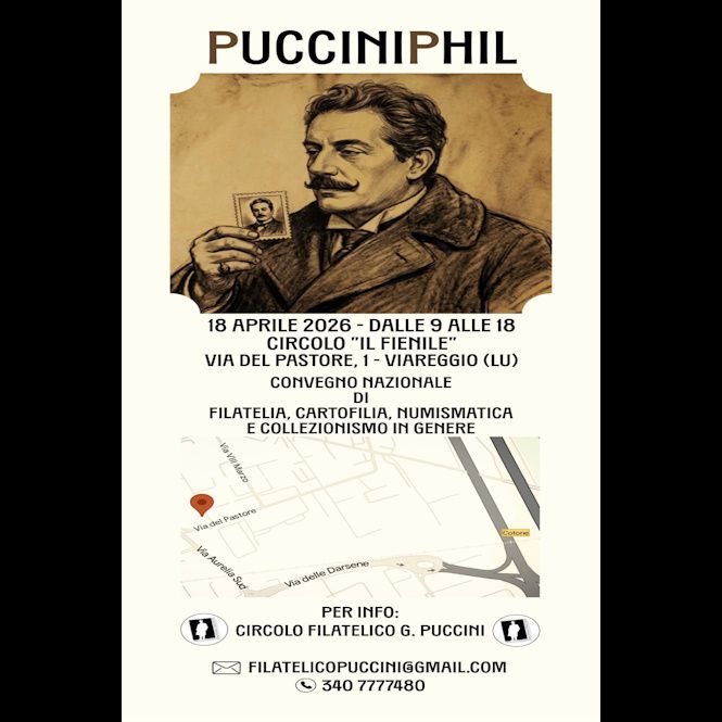 VIAREGGIO - Il Circolo Filatelico Giacomo Puccini è lieto di organizzare una giornata di convegno filatelico il 18 aprile 2026 presso le sale del Circolo Il Fienile di Viareggio (via del Pastore, 1).