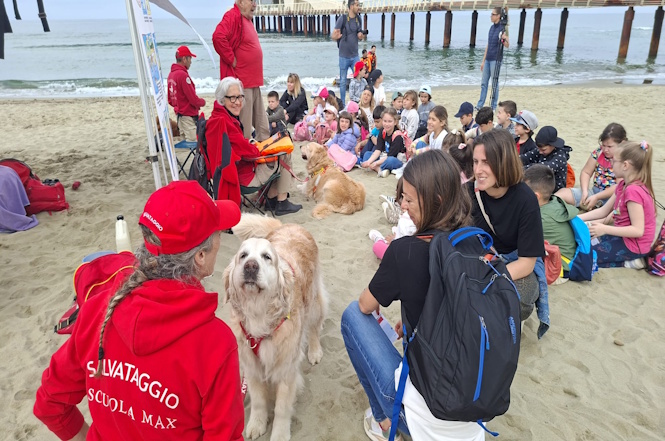 LIDO DI CAMAIORE - La spiaggia di Lido di Camaiore si è trasformata oggi, in un’aula a cielo aperto capace di incantare grandi e piccini. La 15esima edizione di “Papà ti salvo io” — la manifestazione ludico-formativa organizzata dall’Associazione Balneari di Lido di Camaiore — ha visto protagonisti centinaia di bambini delle scuole elementari dell’Istituto Comprensivo Gaber, impegnati per una mattinata intera tra percorsi sulla sicurezza, dimostrazioni di salvataggio e, quest’anno, due irresistibili novità a quattro zampe che hanno rubato la scena.